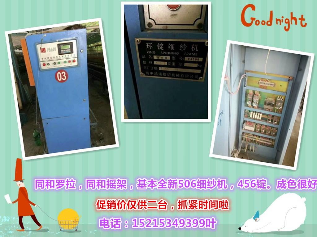 產(chǎn)品規(guī)格 出售:同和羅拉,同和搖架,基本全新506細(xì)紗機(jī),456錠。成色很好、促銷價(jià)僅供二臺(tái)