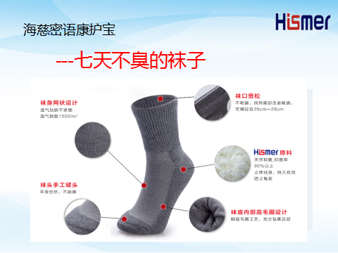 海慈密語康護(hù)寶,含有海斯摩爾纖維(海斯摩爾纖維的獨(dú)特功能:1.自然界中,唯一一個(gè)帶正電荷的高分子材料2.是一個(gè)純天然,強(qiáng)效,持久抑菌功能的纖維。)三個(gè)獨(dú)特的設(shè)計(jì):1.襪口比較寬松,襪口可以橫拉到25-28cm 2.是底部毛圈(1.比較舒服2.吸汗功能特別好)3.手工縫頭三個(gè)獨(dú)特功能:天然抑菌, 止癢祛臭, 防止皴裂被稱為“七天不臭的襪子” |
