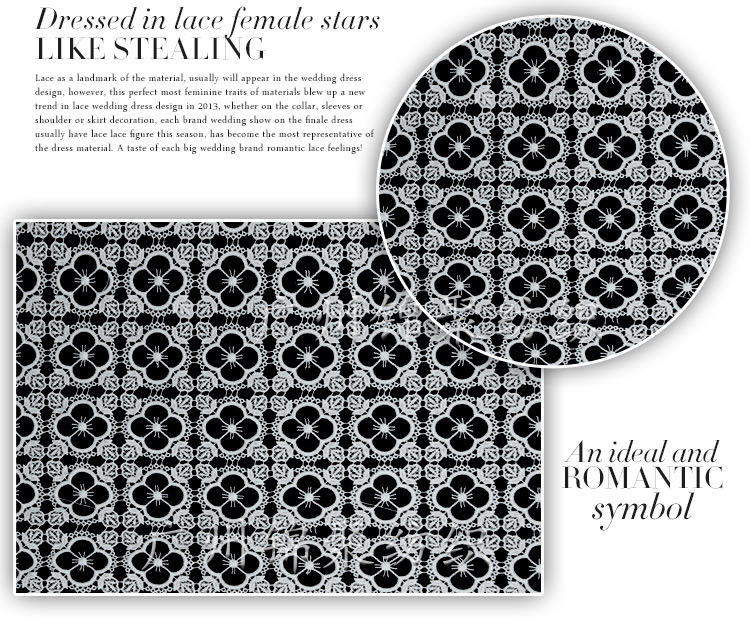 | 產(chǎn)品描述 | http://jinjutextile.1688.com http://jjtextile.en.alibaba.com Basic Information基本信息 面料材質(zhì): 滌綸蕾絲 面料型號: JJ532-240 推薦款式: 連衣裙、短裙、襯衫、禮服等 面料幅寬: 122cm(可定制) 面料花型: 牛奶絲四葉草 面料售價: 39元 面料用途: 服裝面料/服裝輔料 面料顏色: 白色 起拍數(shù)量: 30碼 面料指標: 彈力:適中 (選項:無彈/適中/彈力/超彈力 ) 透視:半透明 (選項:超透/薇透/適中/不透) 厚度:適中 (選項:薄/適中/稍厚/超厚 ) 面料洗滌: 建議干洗 面料說明: 蕾絲有著高貴的血統(tǒng),是高級定制中精湛的手藝,如今運用在高級成衣里,從最初的手工編織的網(wǎng)眼花邊,到服裝上的點綴裝飾,再到透視裝的面料,或華麗純真、或性感妖嬈,總之蕾絲已不再是簡單的服裝裝飾,具有了自己的性格魅力,成為了調(diào)劑女人香的甜蜜芳香劑。 |