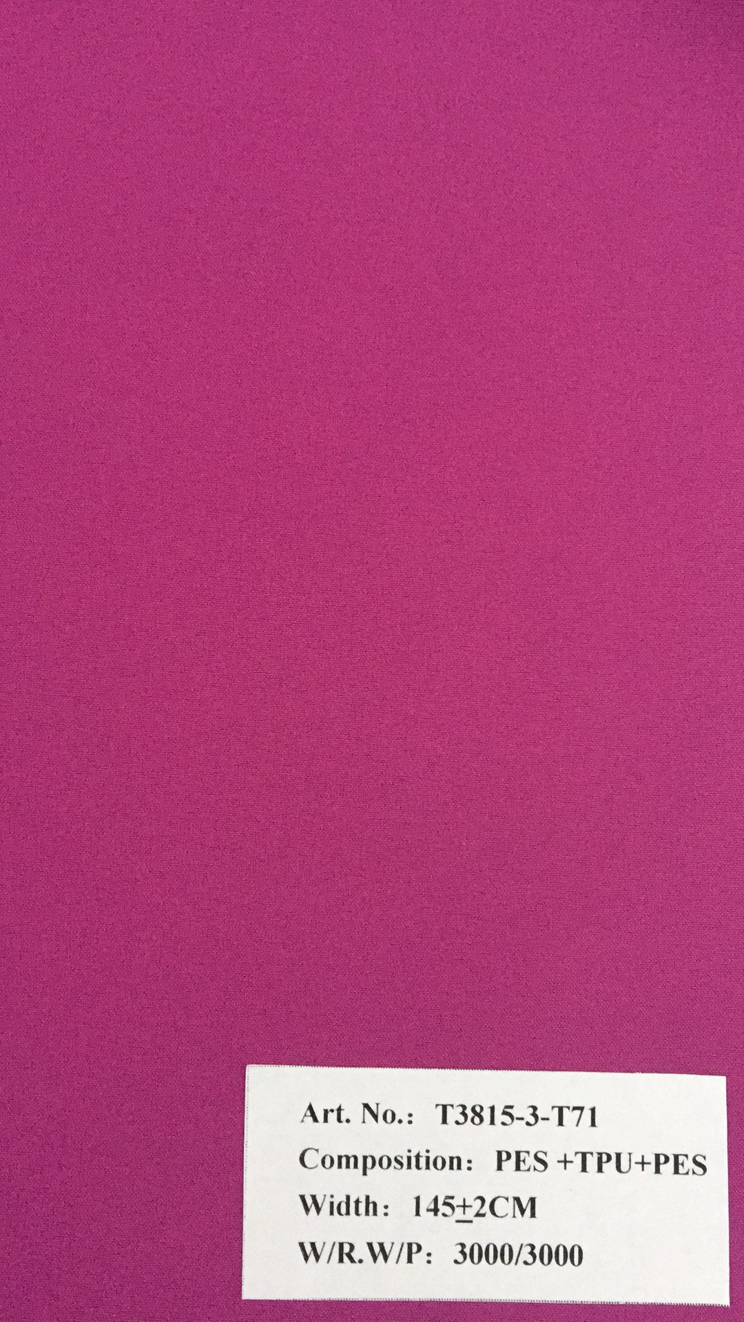 | 產(chǎn)品描述 | 編號(hào):T3815-3-T71 成份:PES+TPU+PES 幅寬:145±2CM 工藝:透氣透濕3000/3000 |
