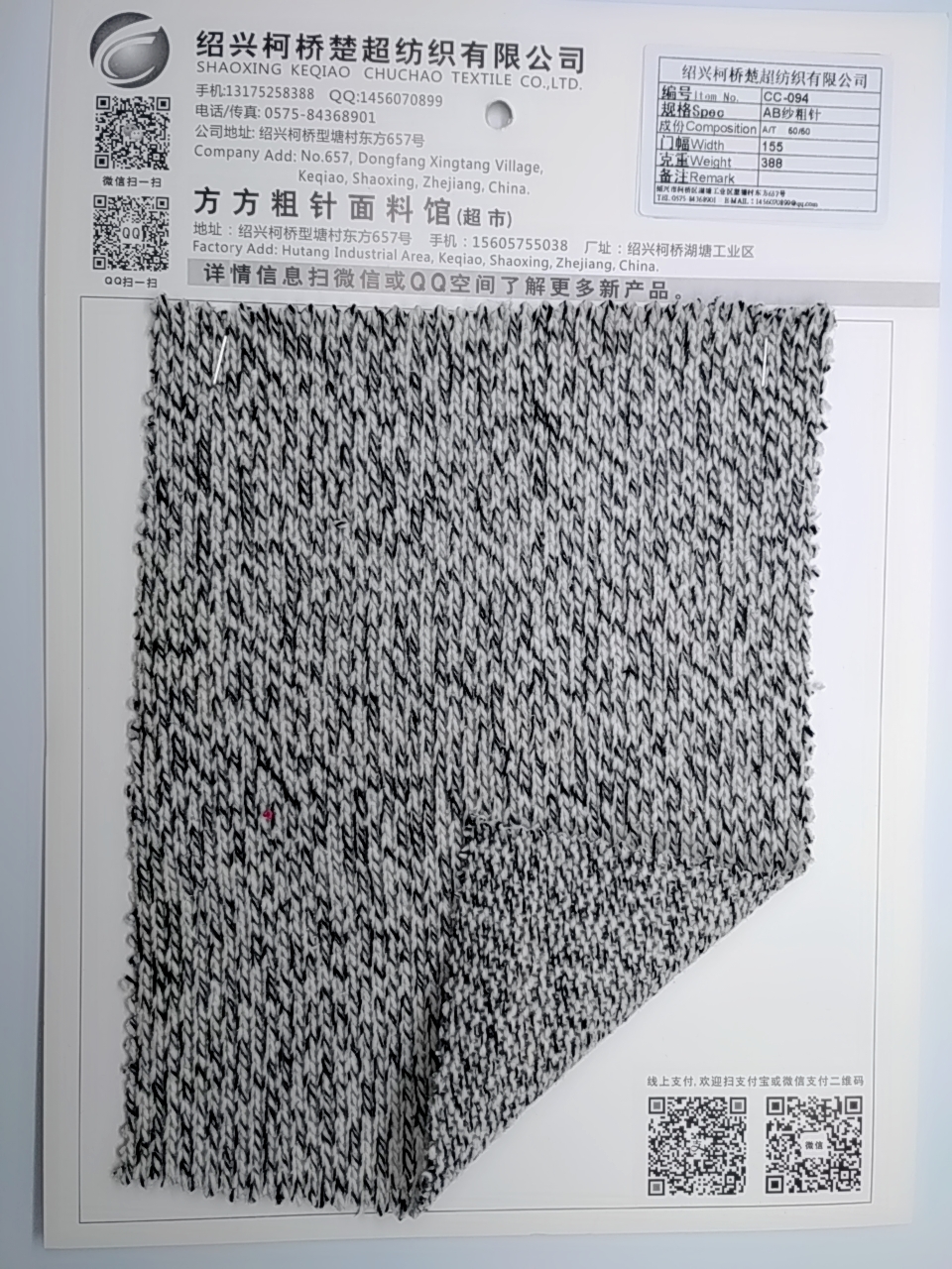 產(chǎn)品描述 編號(hào)I tem No:CC-094 規(guī)格Spec:AB紗粗針 成份Composition: A/T 50/50 門幅Widh: 155 克重Weight:388