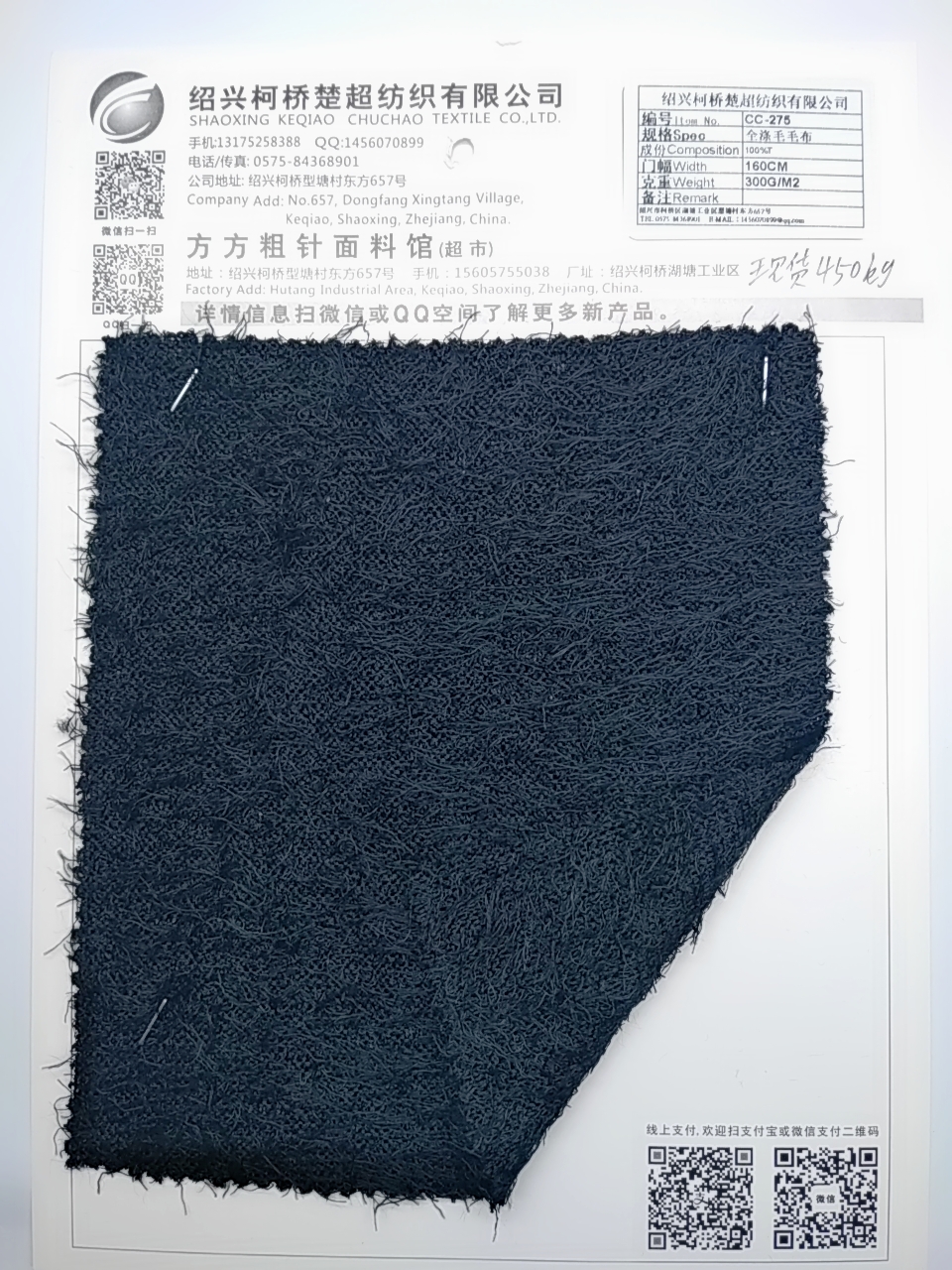| 產(chǎn)品描述 | 編號I tem No:CC-275 規(guī)格Spec:全滌毛毛布 成份Composition: 100%T 門幅Widh: 160 克重Weight:300 |