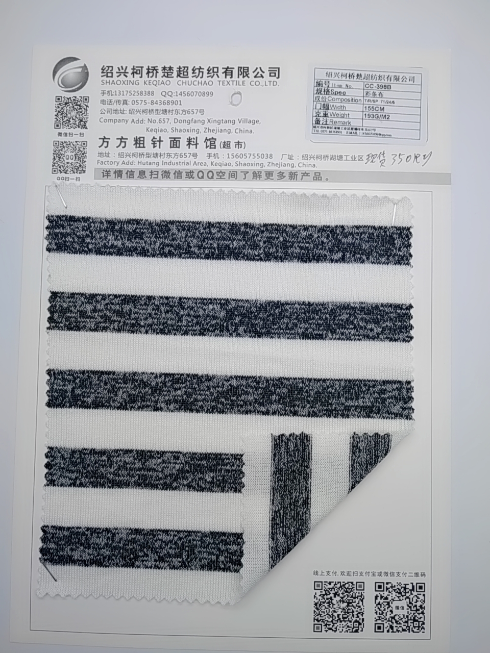 產(chǎn)品描述 編號I tem No:CC-398B 規(guī)格Spec:彩條布 成份Composition: R/T/SP 71/24/5 門幅Widh: 155 克重Weight:193