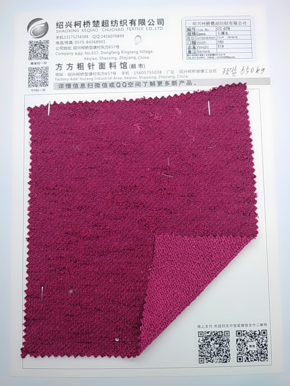 | 產(chǎn)品描述 | 編號I tem No:CC-078 規(guī)格Spec:毛圈布 成份Composition: T/C/R 70/15/15 門幅Widh: 160 克重Weight:319 |