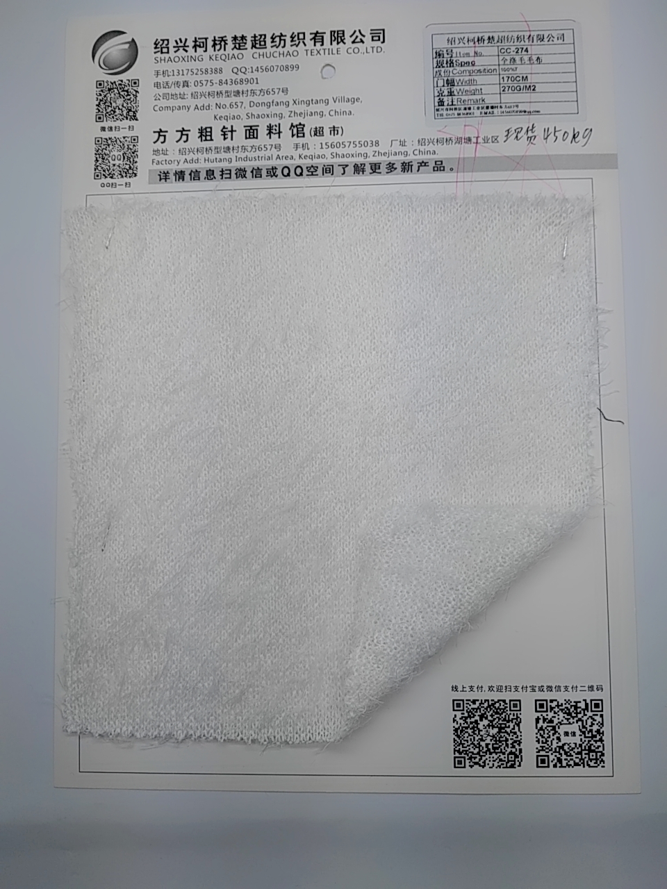 | 產(chǎn)品描述 | 編號(hào)I tem No:CC-274 規(guī)格Spec:全滌毛毛布 成份Composition: 100%T 門幅Widh: 170 克重Weight:270 |