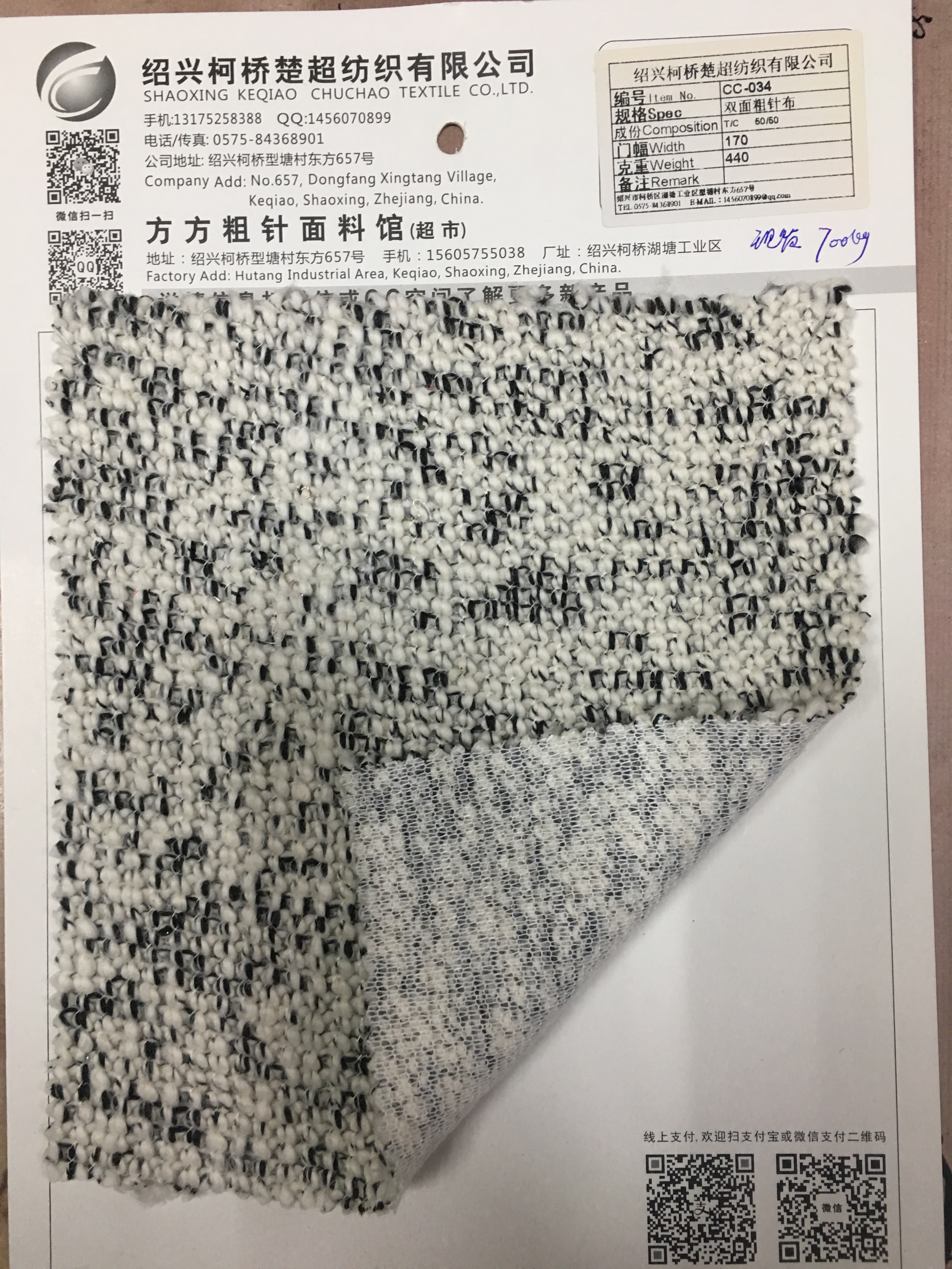 | 產(chǎn)品描述 | 編號I tem No:CC-034 規(guī)格Spec:坑條拉毛布 成份Composition:T/C 50/50 門幅Widh:170 克重Weight:440 |