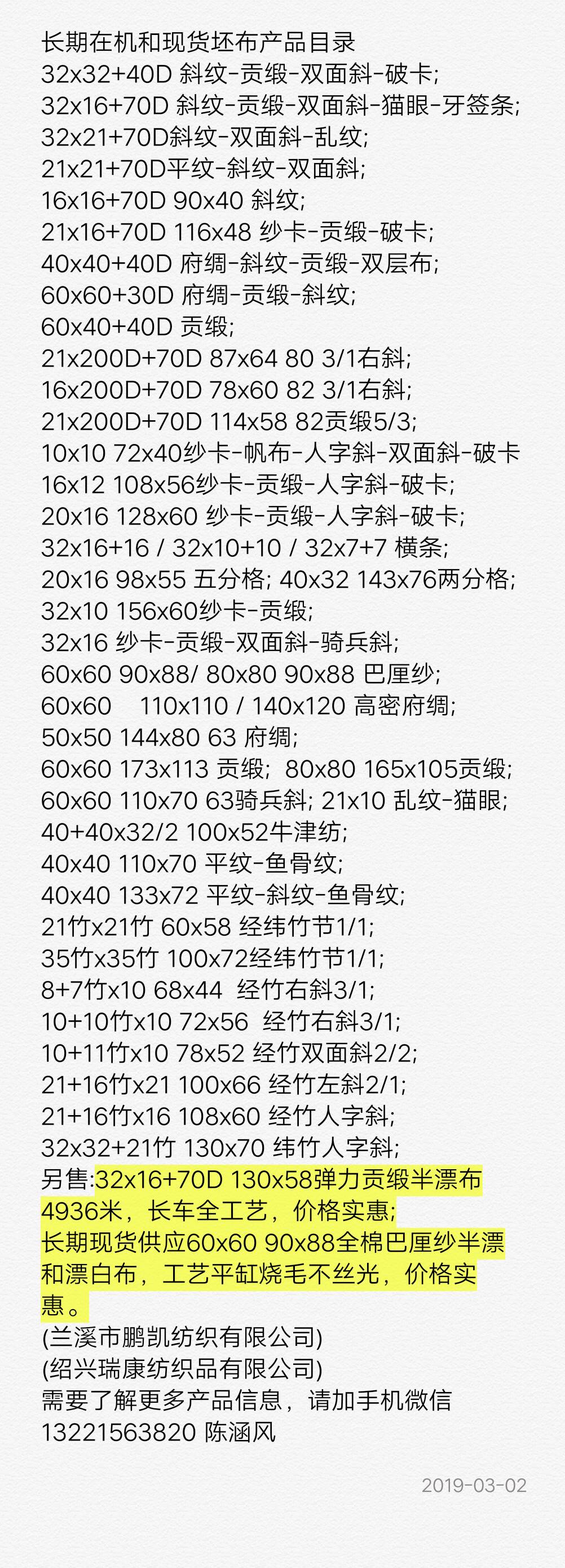 | 產(chǎn)品描述 | 品名:全棉彈力貢緞坯布, 規(guī)格:32x16/70D 130x58 82貢緞, 風(fēng)格:5/3貢緞, 品質(zhì):噴氣,染色坯。 |