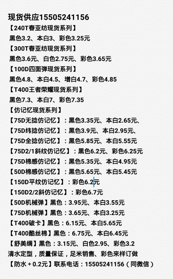 | 備注 | 【75D無捻仿記憶】:黑色3.35元、本白2.65元、【75D緯捻仿記憶】:黑色3.9元、本白2.95元、【75D全捻仿記憶】:黑色5.85元、本白5.55元【75D2/1斜紋仿記憶】:黑色6.2元、彩色6.25元【75D棉感仿記憶】:黑色5.35元、本白4.95元 |