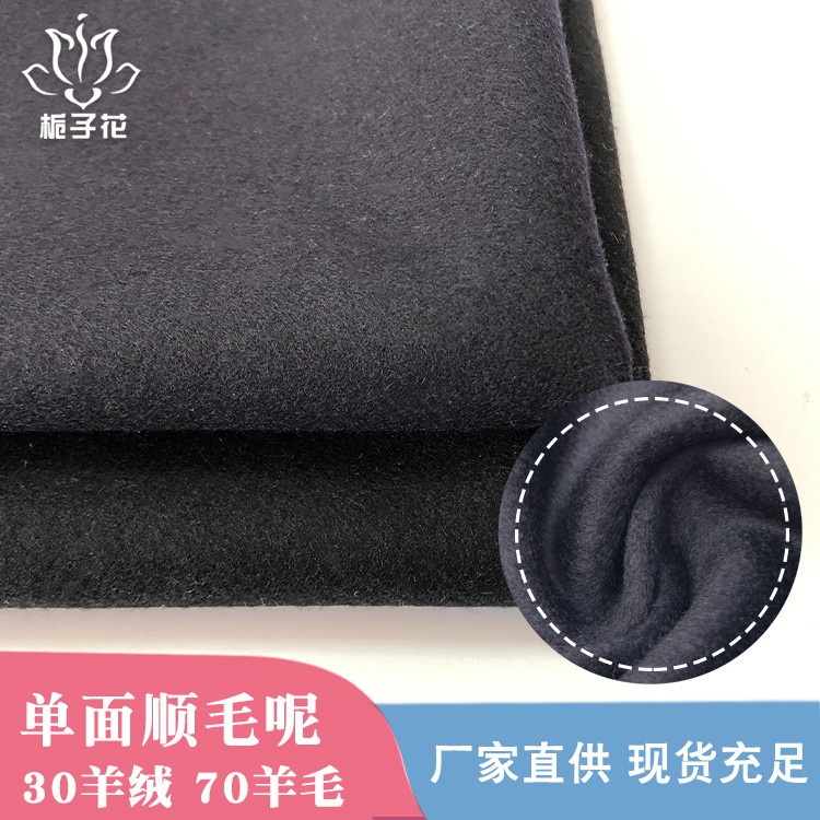 | 產(chǎn)品名稱 | 毛料工廠現(xiàn)貨30羊絨黑色單面順毛呢子面料 |