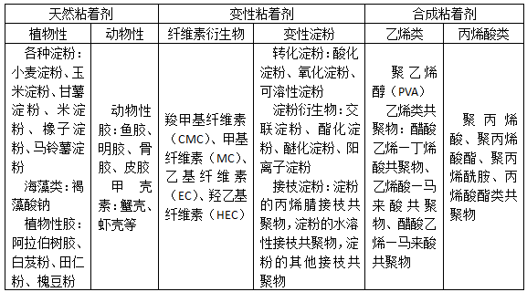 粘著劑是一種具有粘著力的材料,它是構(gòu)成漿液的主體材料(除溶劑水外),漿液的上漿性能主要由它決定。漿紗用的粘著劑分為天然粘著劑、變性粘著劑、合成粘著劑三大類,如下表所示。
