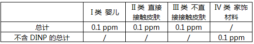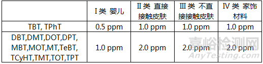 (7)有機(jī)錫化合物/Organic tin compounds限制性列表增加了:Dimethyltin/DMT;Diphenyltin/DPT;Methyltin/MT;Monobutyltin/MBT;Monooctyltin/MOT;Tetrabutyltin/TeBT;Tricylcohexyltin/TCyHT;Trimethyltin/TMT;Trioctyltin/TOT;Tripropyltin/TPT這10種物質(zhì),限值的更改見(jiàn)下表: