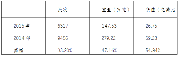 由于受世界經(jīng)濟形勢和國內(nèi)供求關(guān)系變化及價格等因素的影響,2015年全國進口棉花數(shù)量與2014年同期相比呈大幅下降態(tài)勢,全國出入境檢驗檢疫機構(gòu)共計檢驗進口棉花6317批,147.53萬噸,貨值共計26.75億美元,較2014年批次減少減少33.20%、重量減少47.16%、貨值減少54.84%。(見表1)。