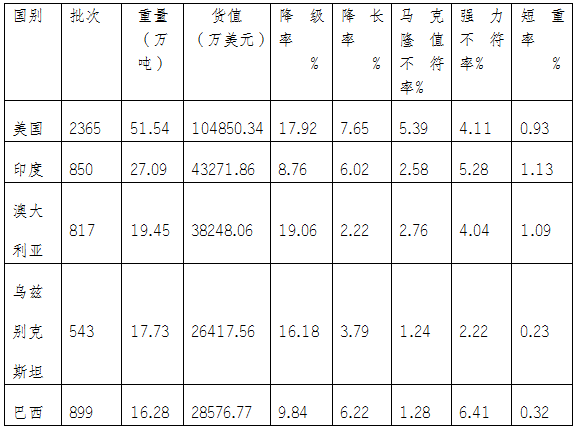 另外,我國還從阿根廷、埃及、巴基斯坦、貝寧、布基納法索、多哥、哈薩克斯坦、津巴布韋、喀麥隆、科特迪瓦、馬達加斯加、馬拉維、馬里、秘魯、莫桑比克、墨西哥、南非、塞內(nèi)加爾、蘇丹、塔吉克斯坦、坦桑尼亞、土耳其、土庫曼斯坦、西班牙、希臘、以色列、英國、贊比亞、乍得、中非以及中國香港共計31個國家和地區(qū)進口棉花,總計843批次、15.44萬噸,總貨值26126.47萬美元,這些進口國家棉花平均降級率為16.98%,降長率為13.45%,馬克隆值不符率為2.13%,強力不符率為6.48%,短重率為0.59%。