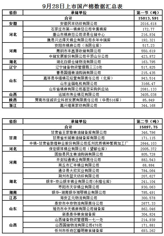 9月28日兩節(jié)共計(jì)輪出儲(chǔ)備棉30111.341噸。第一節(jié)銷售儲(chǔ)備棉15013.5910噸,其中國產(chǎn)棉15013.5910噸、進(jìn)口棉0噸。第二節(jié)銷售儲(chǔ)備棉15097.7500噸,其中國產(chǎn)棉15097.7500噸、進(jìn)口棉0噸。