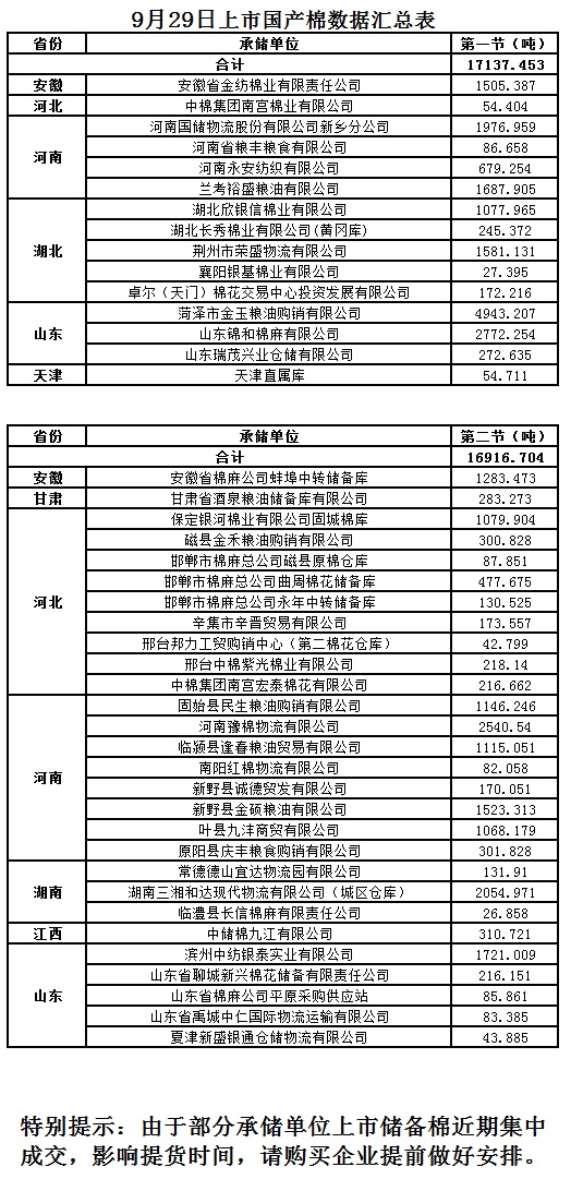 9月29日第二節(jié)交易國(guó)產(chǎn)棉明細(xì)數(shù)據(jù)
