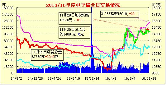 11月29日,電子撮合交易成交量增加,合約均價多數(shù)收漲,活躍交投主要集于中遠合同。據(jù)鹽城市經(jīng)作站棉花生產(chǎn)技術(shù)專家分析,今年鹽城實際植棉面積不足十萬畝,退至歷史最低谷,而且種植品種也很不單純,比較“多亂雜”。今年鹽城棉花產(chǎn)量效益再度呈現(xiàn)減產(chǎn)減收狀況,這對農(nóng)戶重拾植棉信心形成阻力。業(yè)內(nèi)認(rèn)為,棉花年年種,棉價年年調(diào),但今年的籽棉收購報價是近三年來上漲幅度最大的。農(nóng)民在面臨大部分農(nóng)產(chǎn)品價格下行的壓力下,容易重溫種棉舊情,但國家棉花產(chǎn)業(yè)政策西移戰(zhàn)略的實施,還是令眾多棉農(nóng)的植棉情緒無法提振。所以,現(xiàn)在雖在棉種訂購季節(jié),農(nóng)戶對于明年的植棉無定數(shù)己在預(yù)訂種子這個環(huán)節(jié)充分表現(xiàn)出來。
