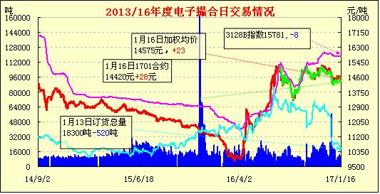 1月16日,電子撮合交易成交量上升,合約均價(jià)全部收漲,活躍交投主要集中于中遠(yuǎn)期合同。12月中旬以后,鄭棉期貨開始不斷下跌,跌破萬六之后,一度跌至14605元/噸,大跌似乎沒有過多的拉低現(xiàn)貨價(jià)格,現(xiàn)貨掛牌價(jià)格維持在14800元/噸一線波動(dòng),現(xiàn)貨報(bào)價(jià)則維持在15600元/噸之上,現(xiàn)貨市場(chǎng)的穩(wěn)定為有采購(gòu)需求的企業(yè)提供了買貨的基礎(chǔ)保障。從各方面來看,賣方出貨意愿不強(qiáng),市場(chǎng)下跌幅度有限,紡企可關(guān)注現(xiàn)貨掛牌購(gòu)入以備后期生產(chǎn)。