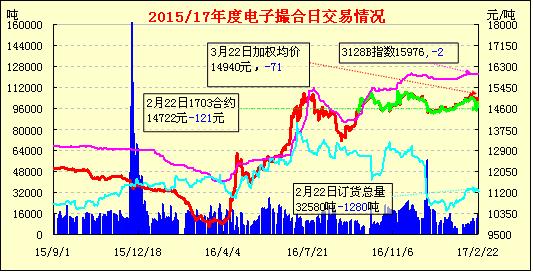 2月22日,電子撮合交易成交量增加,合同均價全部收跌,活躍交投主要集中于中遠期合同。截止21日,滄州地產3128級大包棉出廠價15700-15800元/噸(毛重、提貨價),較上周跌100元/噸左右。據部分滄州本地400型企業(yè)介紹,由于臨近國儲棉輪出,大多變現心理增強,不惜“吐血甩賣”,因此,地產棉現貨價格小幅下滑。而3級、4級小包棉主流價格在14900-15200元/噸,較昨日變化不大。小包棉價格波動不大,主要因為與國儲棉沖突不大。小包棉主要賣給周邊3萬錠以下的小型紡企。