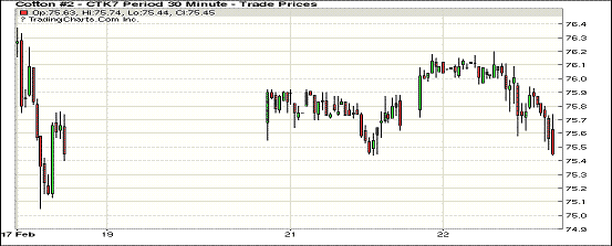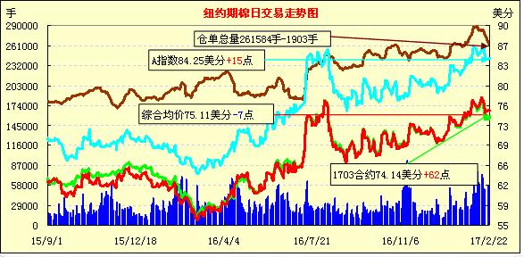 周三紐約期棉除3月合約外,其他合約均小幅下跌;1703合約收于74.14美分/磅,漲62點(diǎn);1705合約收于75.49美分/磅,跌17點(diǎn)。當(dāng)日紐約期棉交投清淡,主力合約開盤后保持小幅上漲趨勢,最高價(jià)在76美分/磅以上,之后合約回落并收跌。目前美國一些私人機(jī)構(gòu)預(yù)測同樣看增2017/18年度美棉種植面積,預(yù)測下年度美國陸地棉和皮馬棉種植總面積在1140萬英畝。印度CAI預(yù)測2016/17年度印度產(chǎn)量在3410萬包(170公斤/包)。