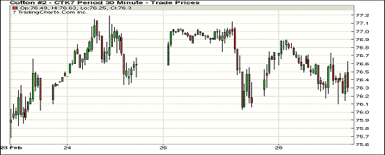 周二紐約期棉延續(xù)前一日整理走勢(shì)呈上漲態(tài)勢(shì);1703合約收于75.33美分/磅,漲36點(diǎn);1705合約收于76.34美分/磅,漲22點(diǎn);1712合約收于74.38美分/磅,漲23點(diǎn)。當(dāng)日5月合約開盤便一路走高,最高飆升至76.89美分,盤中失守跌至76.10美分,收盤前回收漲幅至76.34美分。12月合約則在0.36美分之間窄幅波動(dòng),收盤報(bào)74.38美分。3月合約最后交易日為3月9日。美國農(nóng)業(yè)部一周棉花回顧顯示,上周早春小雨略微影響了美國格蘭德谷底新棉播種,但德州平原2月氣溫整體上高于以往,熱浪來襲有利于土壤升溫,誘發(fā)棉苗。