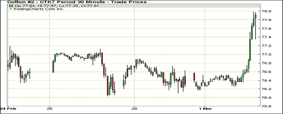 因商品市場上漲,周三紐約期棉主力和近月合約跳漲;1703合約收于76.85美分/磅,漲152點;1705合約收于77.86美分/磅,漲152點。當日主力合約開市后走勢起伏較小,之后在大量買盤下上漲,收盤前合約從高位回落,但依然處于漲幅區(qū)間并保持,最終漲幅超過2%。周四美國農(nóng)業(yè)部即將發(fā)布最新出口周報,美棉可能延續(xù)良好的銷售情況;至2月24日,美棉檢驗達到373萬噸,其中達到SLM1-1/16的達到69.9%,檢驗總量和達到ICE期棉交割要求的棉花大幅高于去年同期。