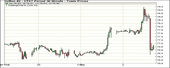 周四紐約期棉走勢(shì)波動(dòng)較大,近月合約最終創(chuàng)較大幅度下跌;1705合約收于76.78美分/磅,跌108點(diǎn);1707合約收于77.86美分/磅,跌87點(diǎn)。當(dāng)日主力1705合約在利好的美棉銷售刺激下暴漲,最高價(jià)突破79美分/磅,遇阻回落后合約在當(dāng)日交投區(qū)間上部波動(dòng),收盤前賣出增加,合約走低。上周美國(guó)凈簽約出口本年度陸地棉10.9萬(wàn)噸,累計(jì)簽約達(dá)到預(yù)計(jì)出口量的94%;裝運(yùn)本年度陸地棉7.2萬(wàn)噸,累計(jì)裝運(yùn)達(dá)到預(yù)計(jì)出口總量的53%。
