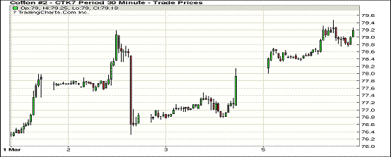 周一紐約期棉延續(xù)前一交易日活躍態(tài)勢,近月合約漲幅在111至114點(diǎn)之間;1703合約收于78.39美分/磅,漲111點(diǎn);1705合約收于79.11美分/磅,漲112點(diǎn);1707合約收于79.97美分/磅,漲114點(diǎn)。1705合約開盤后緩慢攀升,后因投機(jī)助漲大幅上揚(yáng)至79.46美分高點(diǎn),后遇賣盤壓力回吐部分漲幅,終收于79.11美分。6日為1703合約第八通知日,3月合約最后一個(gè)交易日為3月9日。6日為中國儲(chǔ)備棉輪出首日,成交率達(dá)100%。業(yè)界普遍認(rèn)為,美棉出口成績赫赫主要得益于美棉質(zhì)量整體占優(yōu),據(jù)USDA最新發(fā)布的供需報(bào)告,美棉出口未來還有上升空間。