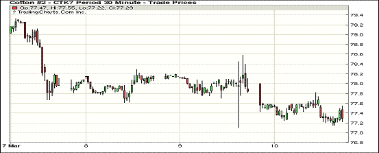 10日紐約期棉受外圍商品整體下跌影響繼續(xù)收跌,主力5月合約結(jié)算價(jià)77.29美分/磅,跌53點(diǎn)。當(dāng)日主力5月合約整日交易在77-78美分間波動(dòng),穩(wěn)定開盤后微幅走高,到交易后期隨商品市場特別是原油市場下跌對期棉造成壓力,最終期棉與谷物等商品期貨一并下跌收盤。