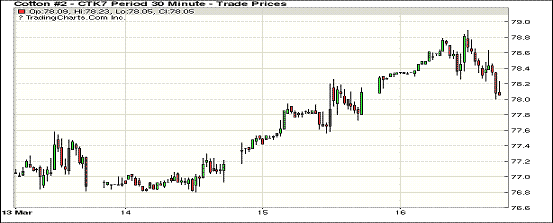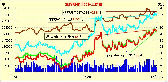 周四紐約期棉呈整理走勢,近月合約小幅收漲。1705合約收于78.17美分/磅,漲9點;1707合約收于79.12美分/磅,漲3點。開盤后1705合約一路支撐上漲,一度飆升至78.89美分/磅,創(chuàng)近10日內(nèi)新高,尾盤震蕩收于78.17美分/磅。1712合約亦沖高回落,止于75.64美分/磅。市場還在消化15日美聯(lián)儲加息消息,美元指數(shù)16日繼續(xù)承壓。據(jù)美國農(nóng)業(yè)部(USDA),3月3日至3月9日美國凈簽約出口2016/17年度陸地棉7.18萬噸,較前周增加27%,凈簽約本年度皮馬棉5511噸,較前周增加72%。