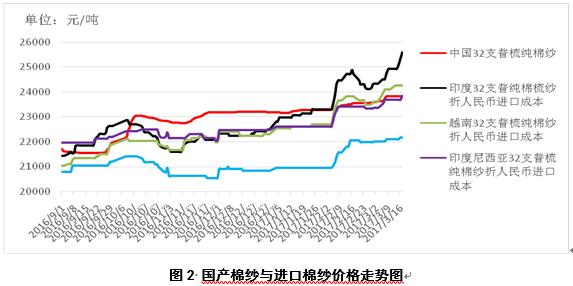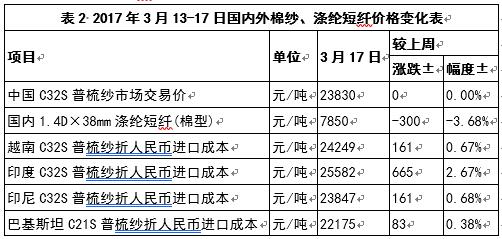 本周,國內(nèi)棉紗價格平穩(wěn),滌綸短纖價格跌勢未改;國際棉紗價格繼續(xù)上漲,印度紗價漲幅擴大。(表2)。