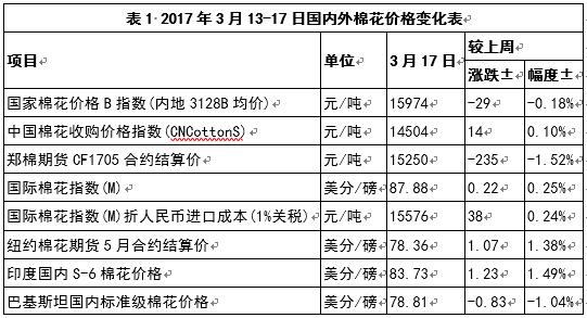 兩部委關(guān)于深化棉花目標(biāo)價格改革的通知明確了2017—2019年新疆棉花目標(biāo)價格水平為每噸18600元,穩(wěn)定了市場預(yù)期。3月6日以來國內(nèi)儲備棉供應(yīng)保持穩(wěn)定,紡織企業(yè)采購心態(tài)趨于理性。同時,國外棉花、棉紗價格走勢偏強。預(yù)計近期國內(nèi)棉價可能保持相對平穩(wěn)走勢。