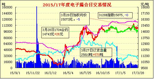 28日電子撮合交易成交量下降,合同均價(jià)多數(shù)收漲,活躍交投主要集中于中遠(yuǎn)期合同。27日國(guó)儲(chǔ)棉競(jìng)拍成交率58.87%,再創(chuàng)輪儲(chǔ)新低,這是輪儲(chǔ)以來(lái)首次成交率跌破60%。與此同時(shí),成交均價(jià)再降116元/噸至14653元/噸。由于國(guó)儲(chǔ)棉成交量?jī)r(jià)齊跌,部分業(yè)界人士再次慌了手腳。