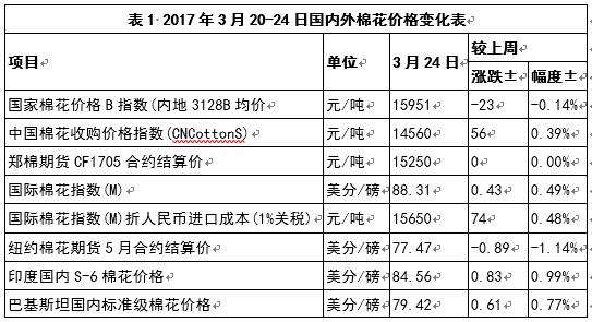 本周,國內(nèi)棉花現(xiàn)貨價格依然平穩(wěn)偏弱,鄭棉期貨大幅波動;國際棉花現(xiàn)貨價格堅挺,ICE期棉振蕩調(diào)整(表1)。