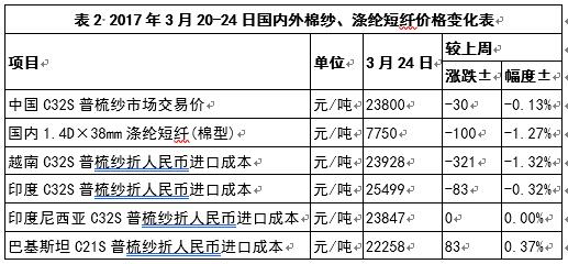 本周,國內(nèi)棉紗價格下跌,滌綸短纖價格延續(xù)弱勢;國際棉紗價格略有下跌(表2)。