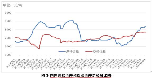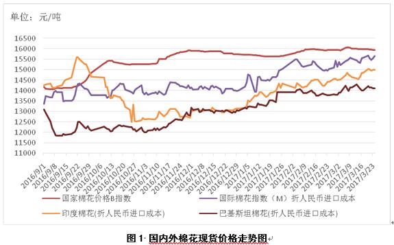 1、內(nèi)外棉花價差繼續(xù)縮小。3月24日,國際棉花指數(shù)(M)按折人民幣進口成本15650元/噸(1%關(guān)稅,海關(guān)計征匯率,下同),低于國內(nèi)標準301元/噸,價差較上周縮小98元/噸;印度國內(nèi)S-6棉花折人民幣進口成本15002元/噸,低于國內(nèi)949元/噸,價差較上周縮小163元/噸;巴基斯坦國內(nèi)標準級棉花折人民幣進口成本14115元/噸,低于國內(nèi)1836元/噸,價差較上周縮小129元/噸(圖1)。