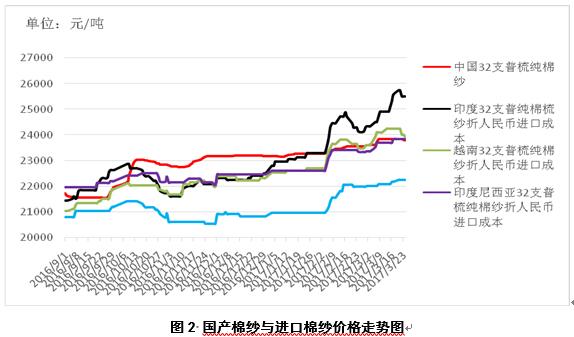 2、內(nèi)外棉紗價差縮小。3月24日,越南32支普梳純棉紗23928元/噸(折人民幣進口成本,下同),較中國國內(nèi)32支普梳純棉紗高128元/噸,價差較上周縮小219/噸;印度32支普梳純棉紗25499元/噸,較中國國內(nèi)32支普梳純棉紗高1699元/噸,價差較上周縮小53元/噸;印度尼西亞32支普梳純棉紗23847元/噸,較中國國內(nèi)32支普梳純棉紗高47元/噸,價差較上周擴大30元/噸(圖2)。