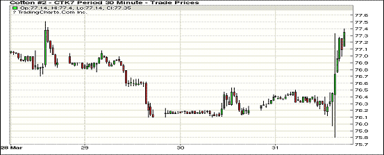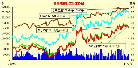 周五紐約期棉全盤強(qiáng)力反彈,近月合約漲幅在39至110點(diǎn)不等。1705合約收于77.33美分/磅,增110點(diǎn);1707合約收于78.59美分/磅,增99點(diǎn)。受USDA種植意向報(bào)告提振,1705合約午后強(qiáng)勁上漲,在160點(diǎn)波動(dòng)區(qū)間高位波動(dòng),終收于77.33美分/磅。1712終止四連跌,收高于74.09美分/磅。1705合約第一通知日為4月24日。31日USDA發(fā)布17年美國(guó)農(nóng)作物種植意向報(bào)告,其中全美種植面積預(yù)期約1223.3萬(wàn)英畝,較16年大增21個(gè)百分點(diǎn),陸地棉預(yù)期約1200.1萬(wàn)英畝,增21%,其中德州陸地棉預(yù)期690萬(wàn)英畝;皮馬棉預(yù)期約23.2萬(wàn)英畝,增19%。
