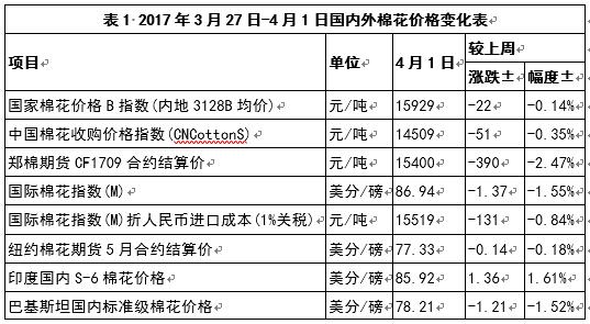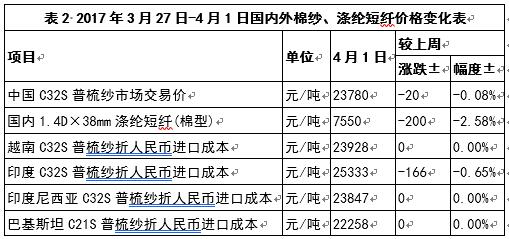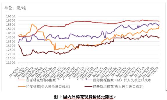 截至3月23日,美國(guó)2016/17年度棉花出口簽約量累計(jì)達(dá)到291.5萬(wàn)噸,超出USDA預(yù)測(cè);據(jù)USDA3月31日發(fā)布的棉花種植意向面積預(yù)測(cè),2017/2018年美國(guó)植棉面積同比增長(zhǎng)21.4%,為2012年以來(lái)最高水平,另?yè)?jù)USDA展望論壇預(yù)測(cè),2017年度印度、巴基斯坦、中國(guó)植棉面積均有所增加。本周印度棉價(jià)跳漲,印度紡織廠大量簽約性?xún)r(jià)比較高的美棉和西非棉;巴基斯坦棉花基本售罄,棉價(jià)堅(jiān)挺。