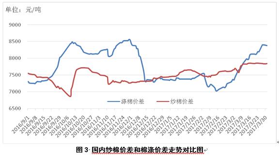 3月27日-4月1日,儲(chǔ)備棉輪出成交10.57萬(wàn)噸,成交率58.62%,成交均價(jià)14754元/噸,較前周上漲22元/噸,成交均價(jià)折3128級(jí)價(jià)格15975元/噸,較前周上漲34元/噸。國(guó)家棉花市場(chǎng)監(jiān)測(cè)系統(tǒng)調(diào)查結(jié)果顯示,2017年全國(guó)棉花意向種植面積同比增5%,較2016年11月份調(diào)查結(jié)果擴(kuò)大2.8個(gè)百分點(diǎn);商品棉價(jià)格略跌,銷(xiāo)售進(jìn)度一般,下游棉紗價(jià)格略有下調(diào),銷(xiāo)售相對(duì)順暢,紡企原料及產(chǎn)品庫(kù)存均保持較低水平。