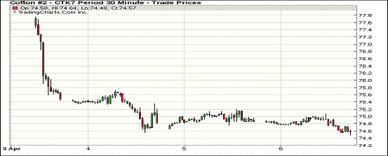 周四紐約期棉近月合約承壓下行,跌幅在9-36點不等。1705合約收于74.51美分/磅,跌36點;1707合約收于76.40美分/磅,跌26點。當(dāng)日1705合約開盤后開啟震蕩模式,午后遇大量賣盤壓力收跌于74.51美分/磅;1712合約收盤前30分鐘同遭拋盤,收跌于73.27美分/磅。外圍方面,大宗谷物商品近月價格普遍下跌客觀刺激期棉承壓。截至3月30日當(dāng)周,2016/17年度美棉簽約出口量28.46萬包;截至當(dāng)日,美國16/17年度累計簽約出口量1313.8萬包。美棉簽約量已超額完成USDA出口預(yù)期。有預(yù)測稱,接下來17周美棉裝運量均值保持在23.97萬包/周即可完成任務(wù)。