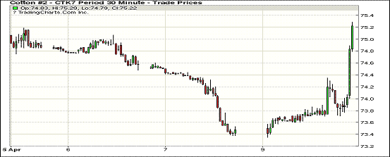 周一紐約期棉止跌反彈,近月合約漲幅在94至169點(diǎn)不等。1705合約收于75.15美分/磅,漲169點(diǎn);1707合約收于76.81美分/磅,漲134點(diǎn)。當(dāng)日近月合約一路走高,收盤(pán)前均在交投區(qū)間高位波動(dòng)。1705合約沖破前一日低谷,收于75.15美分/磅;1705成交量有所減少,資金繼續(xù)向7月展期。有貿(mào)易商及分析人士看增美棉出口預(yù)期數(shù)據(jù)并預(yù)測(cè)美棉期末庫(kù)存將相應(yīng)減少,但美國(guó)內(nèi)紡企消費(fèi)量是否能達(dá)到USDA此前330萬(wàn)包預(yù)期仍存疑問(wèn)。