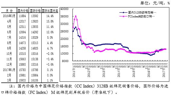 ?。ㄒ唬﹪?guó)內(nèi)棉價(jià)環(huán)比下跌。3月6日儲(chǔ)備棉開始投放,供應(yīng)穩(wěn)定,紡織企業(yè)采購(gòu)心態(tài)平穩(wěn),3月17日國(guó)家發(fā)改委發(fā)布《關(guān)于深化棉花目標(biāo)價(jià)格改革的通知》,進(jìn)一步穩(wěn)定市場(chǎng)預(yù)期,國(guó)內(nèi)皮棉價(jià)格穩(wěn)中略降。3月國(guó)內(nèi)3128B級(jí)棉花月均價(jià)每噸15933元,環(huán)比跌0.3%,同比漲34.1%。鄭棉期貨近期合約(CF705)月結(jié)算價(jià)每噸14880元,環(huán)比跌6.7%,同比漲36.3%。