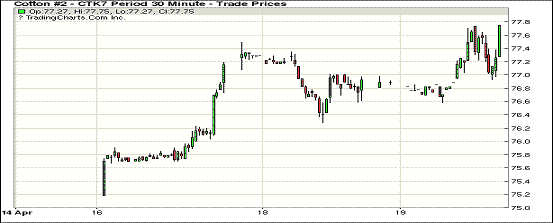 周三紐約期棉全盤上漲且近強遠弱,1705合約收于77.67美分/磅,漲85點;1707合約收于78.32美分/磅,漲16點;1710合約收于74.08美分/磅,漲13點。當日1707合約一天歷經波瀾起伏,開盤后買盤支撐至78.98美分高點,后遇阻力滑落至132點交投區(qū)間低位,收盤前買家再次挽救最終使其小幅收漲。1712合約同樣見證漲跌互現(xiàn)的局面,最后僅斬獲5點漲幅。3月31至4月6日美國出口周報中,16/17年度美國陸地棉出口簽約微幅放緩,一周30.72萬包的數(shù)據很可能延續(xù)至本周四。此前USDA月報(4月)將美棉出口預期調增80萬包,有消息傳言5月美國農業(yè)部將再次上調美棉出口數(shù)據。