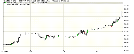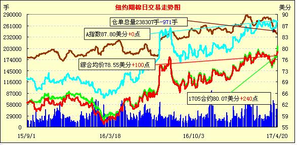 周四紐約期棉全線上漲,1705合約收于80.07美分/磅,漲240點(diǎn);1707合約收于79.11美分/磅,漲79點(diǎn);1710合約收于74.63美分/磅,漲55點(diǎn)。開盤后1707合約有所承壓,得買盤支撐一路升至79.39美分,創(chuàng)近1個(gè)月來最高,終落于106點(diǎn)交投區(qū)間高位,收漲于79.11美分/磅。至4月13日當(dāng)周,16/17美棉出口凈簽約量23.70萬包,較前一周減少7.99萬包,裝運(yùn)量36.72萬包,較前一周減少9.1萬包。目前裝運(yùn)量已完成年度預(yù)期的70%。接下來15周,若要達(dá)到USDA預(yù)期,周平均裝運(yùn)量需保持在26.84萬包左右。