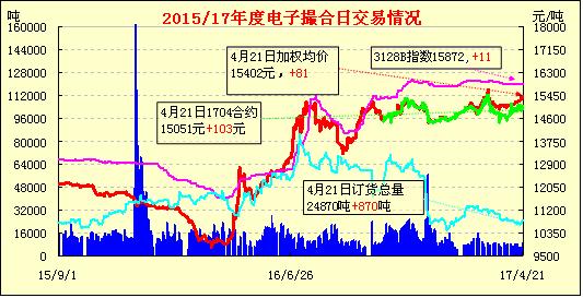 4月21日電子撮合交易成交量減少,合同均價(jià)多數(shù)收漲,活躍交投主要集中于中遠(yuǎn)期合同。據(jù)中棉協(xié)的數(shù)據(jù):2017年全國(guó)植棉意向面積為4286.1萬(wàn)畝,同比增長(zhǎng)3.79%,比上期預(yù)測(cè)增加0.94個(gè)百分點(diǎn)。其中,新疆棉農(nóng)植棉意向增加2.39%,較上期回升0.65個(gè)百分點(diǎn);長(zhǎng)江流域和黃河流域同比分別增加5.82%和7.44%,增幅較上期分別擴(kuò)大0.71個(gè)百分點(diǎn)和1.92個(gè)百分點(diǎn)。各地棉花面積增幅較小,預(yù)計(jì)下一年度棉花供需仍是偏緊格局,國(guó)儲(chǔ)棉將會(huì)繼續(xù)輪出以彌補(bǔ)市場(chǎng)“缺口”。