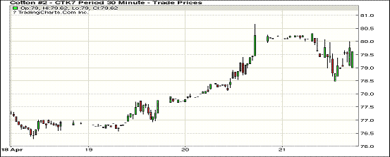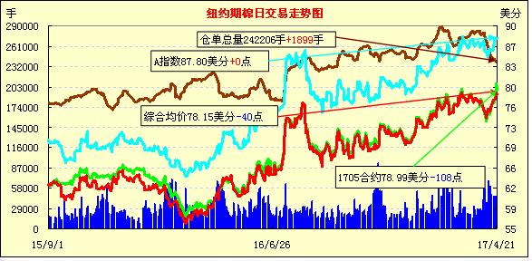 周五雖外圍美元指數(shù)上揚(yáng),谷物期貨下跌,但紐約期棉除5月合約受即將到期影響下跌,其他合約均保持穩(wěn)定,1707月合約79.33美分/磅,漲22點(diǎn)。當(dāng)日7月合約穩(wěn)定開(kāi)盤(pán),盤(pán)中受賣(mài)盤(pán)打壓跌破79美分,交易后期反彈以小漲收盤(pán)。分析師指出,5月合約將于4月24日進(jìn)入交割期,紡織廠要么點(diǎn)價(jià)要么將基準(zhǔn)合約后移,前一交易日沖破80美分與點(diǎn)價(jià)有關(guān),進(jìn)入交割期后,未點(diǎn)價(jià)合約基準(zhǔn)價(jià)多數(shù)將移到7月,對(duì)7月合約亦形成支持。美棉出口勢(shì)頭強(qiáng)勁,紐約期棉登記庫(kù)存量減少,支持紐約期棉穩(wěn)定。