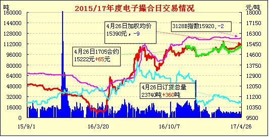 4月26日電子撮合交易成交量減少,合同均價(jià)全部收漲,活躍交投主要集中于中遠(yuǎn)期合同。2016年度江蘇棉花收購工作已結(jié)束。據(jù)生產(chǎn)經(jīng)營一線反映,目前江蘇軋花企業(yè)己停止生產(chǎn)加工棉花。盡管收購結(jié)束,但江蘇籽棉報(bào)價(jià)仍停留于3.60-3.75元/斤上下,明顯高于上年同期。
