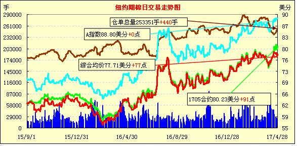 月末最后一個(gè)交易日紐約期棉市場(chǎng)普漲,1707月合約78.87美分/磅,漲91點(diǎn),1712月合約74.64美分,漲32點(diǎn)。當(dāng)日7月合約開(kāi)盤(pán)后在78美分以下波動(dòng),交易中期低位潘振,交易后期漲勢(shì)明顯,最終回歸79美分附近,終收于近高點(diǎn)。據(jù)CFTC,前一周7月合約未點(diǎn)價(jià)合約量繼續(xù)增加;另本年度美棉超賣(mài),對(duì)市場(chǎng)形成支持。