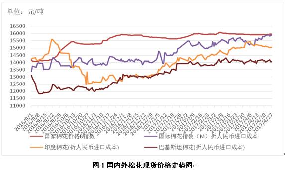 1、內(nèi)外棉花價差進一步縮小,中印、中巴棉價差繼續(xù)擴大。4月27日,國際棉花指數(shù)(M)折人民幣進口成本15881元/噸(1%關(guān)稅,海關(guān)計征匯率,下同),低于國內(nèi)標準70元/噸,價差較上周縮小48元/噸;印度國內(nèi)S-6棉花折人民幣進口成本15041元/噸,低于國內(nèi)910元/噸,價差較上周擴大84元/噸;巴基斯坦國內(nèi)標準級棉花折人民幣進口成本14048元/噸,低于國內(nèi)1903元/噸,價差較上周擴大136元/噸(圖1)。