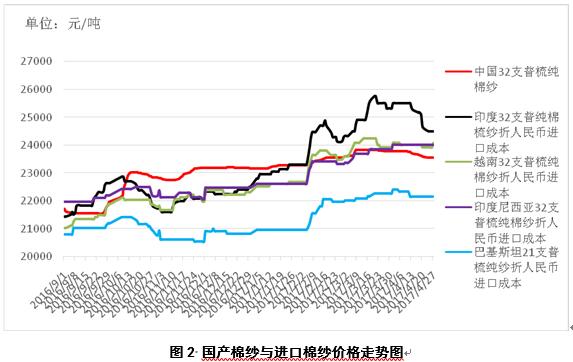 2、內(nèi)外棉紗價差繼續(xù)擴大,中印棉紗價差繼續(xù)縮小。4月27日,越南32支普梳純棉紗24093元/噸(折人民幣進口成本,下同),較中國國內(nèi)32支普梳純棉紗高543元/噸,價差較上周擴大202元/噸;印度32支普梳純棉紗24504元/噸,較中國國內(nèi)32支普梳純棉紗高954元/噸,價差較上周縮小127元/噸;印尼32支普梳純棉紗24012元/噸,較中國國內(nèi)32支普梳純棉紗高462元/噸,價差較上周擴大40元/噸(圖2)。
